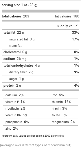 A one-ounce serving of macadamia nuts contains 22 grams of fat, including monounsaturated and polyunsaturated fats that can help reduce inflammation and improve heart health. Additionally, macadamia nuts are a good source of fiber, protein, magnesium, manganese, and thiamine.