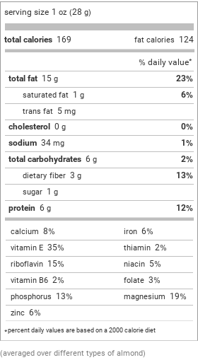 Calories and Macronutrients: A 1-ounce (28g) serving of almonds contains approximately 169 calories. While almonds are relatively high in calories, they also provide a balanced combination of macronutrients. Each serving typically contains 15 grams of fat, including heart-healthy monounsaturated fats, 6 grams of carbohydrates, and 6 grams of plant-based protein.